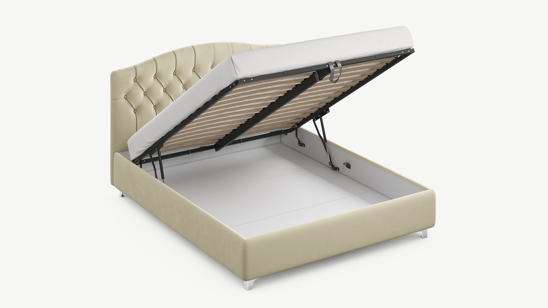 - Скрытая под основанием вместительная емкость без внутренних перегородок позволяет использовать всю площадь подкроватного пространства для хранения вещей.