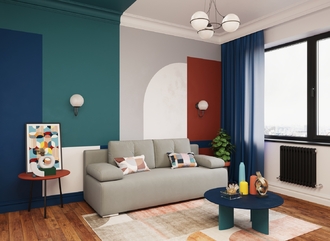 Спинка, выполненная в обивочной ткани, позволяет ставить диван в центре комнаты и зонировать пространство.