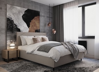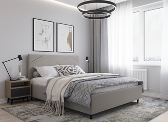 MOON FAMILY 1257 привлекает внимание оригинальным исполнением: широкие полосы ткани эффектно пересекают периметр изголовья, создавая на нем графический орнамент. Лаконичные формы объемных царг создают единый гармоничный образ и фокусируют внимание на центральном текстурном элементе кровати.