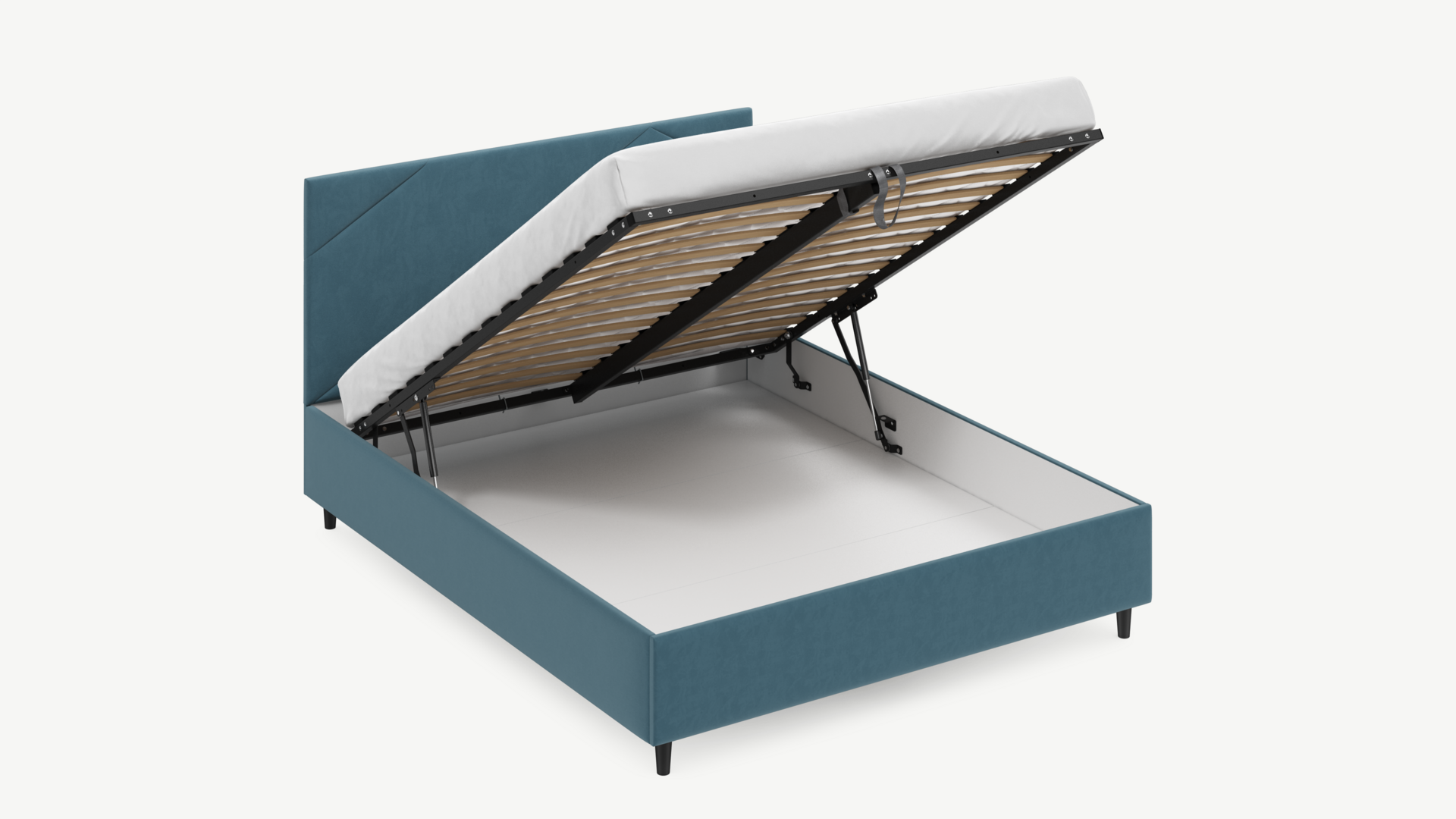 • Скрытая под основанием вместительная емкость без внутренних перегородок позволяет использовать всю площадь подкроватного пространства для хранения вещей.