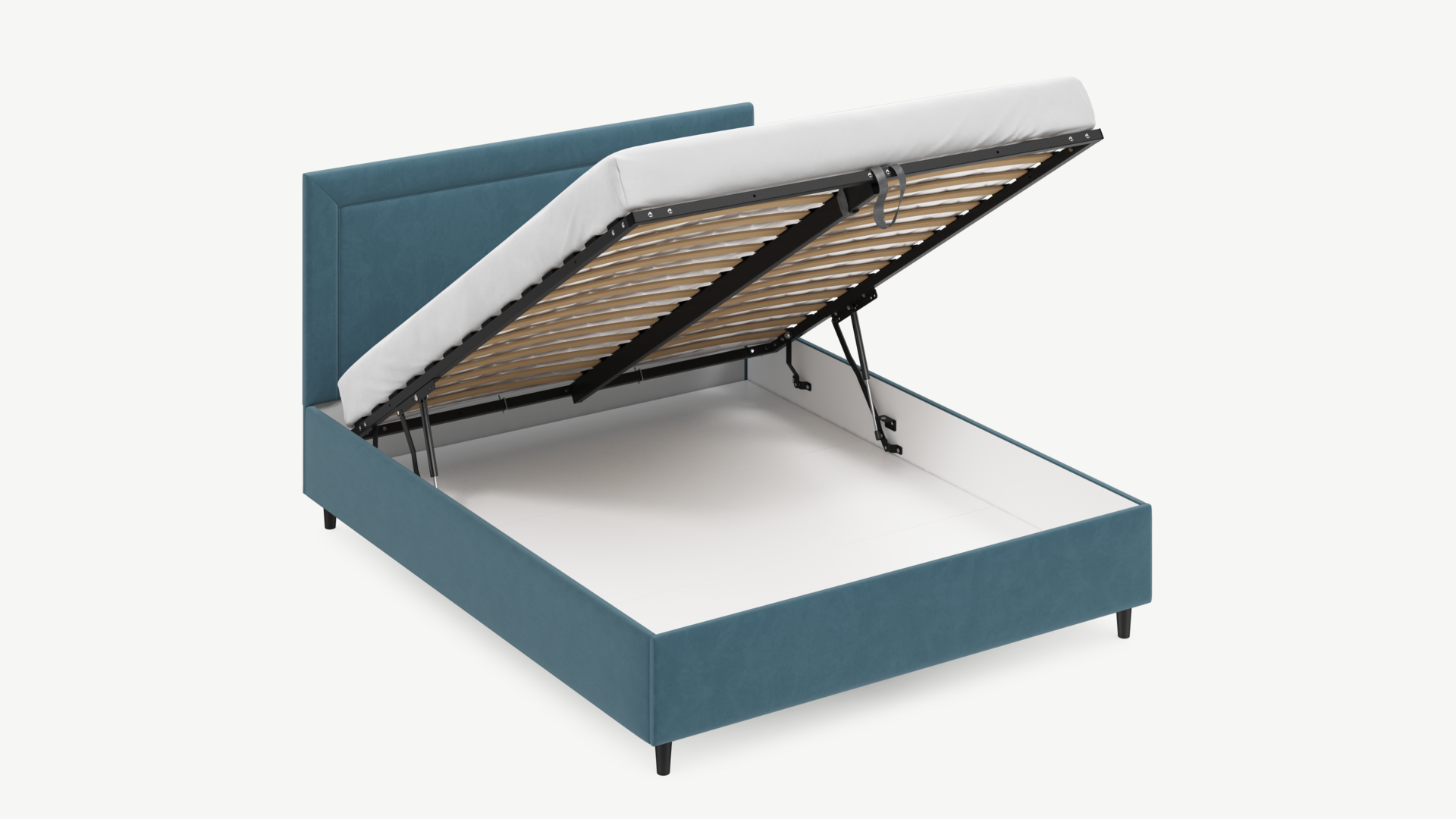 Вместительная емкость под кроватью без внутренних перегородок позволяет использовать для хранения вещей 100% пространства.