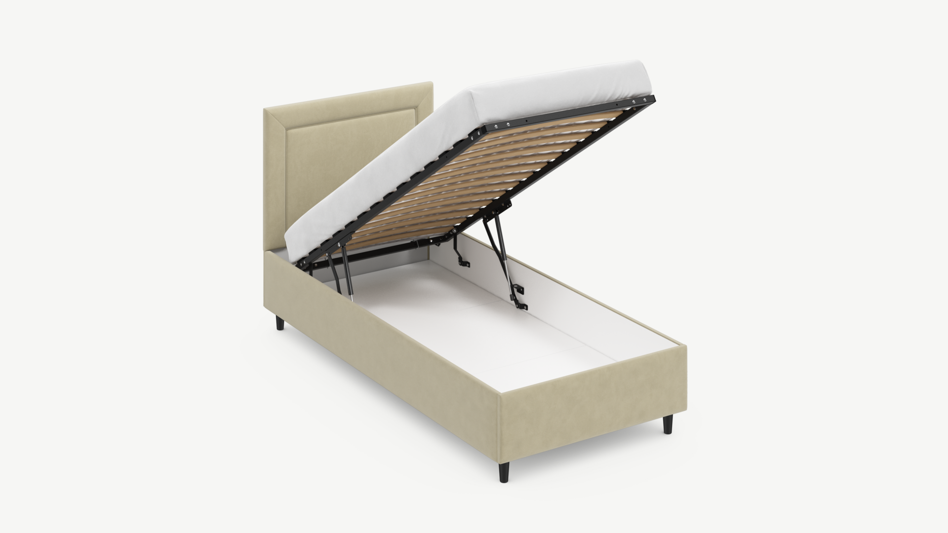 • Скрытая под основанием вместительная емкость без внутренних перегородок позволяет использовать всю площадь подкроватного пространства для хранения вещей.