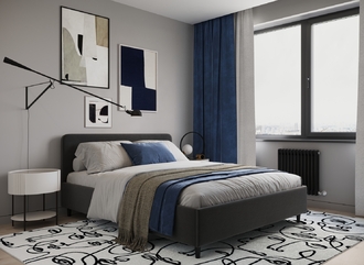 Царга, задающая пропорции, благодаря гладкости своей фактуры подчеркивает центральный элемент декора. Высокие опоры приподнимают фигуру кровати над полом и добавляют её образу визуальной легкости.