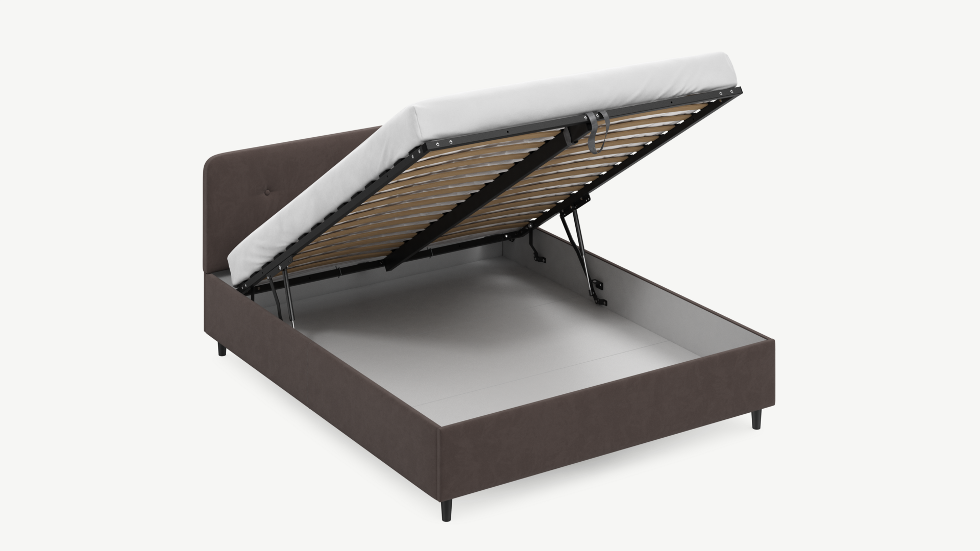 • Скрытая под основанием вместительная емкость без внутренних перегородок позволяет использовать всю площадь подкроватного пространства для хранения вещей.