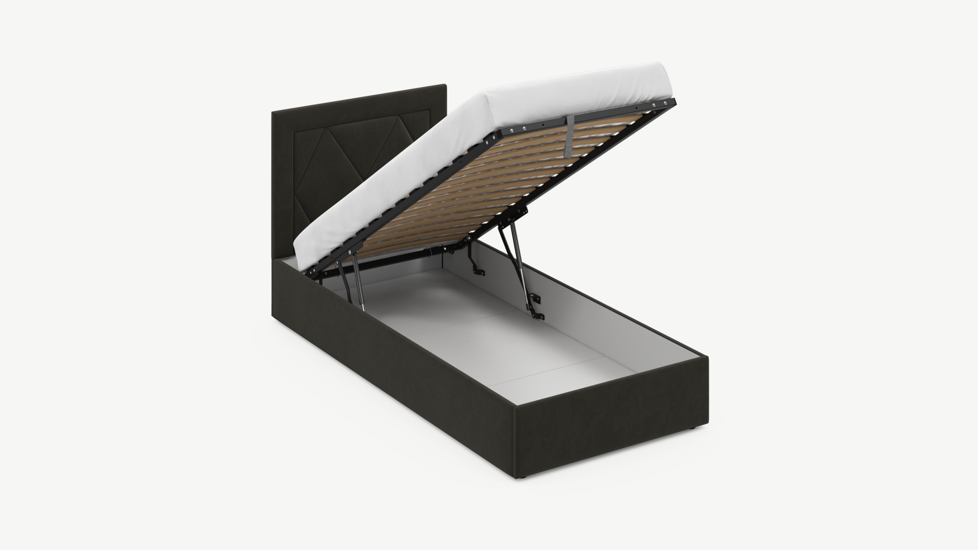 • Скрытая под основанием вместительная емкость без внутренних перегородок позволяет использовать всю площадь подкроватного пространства для хранения вещей.