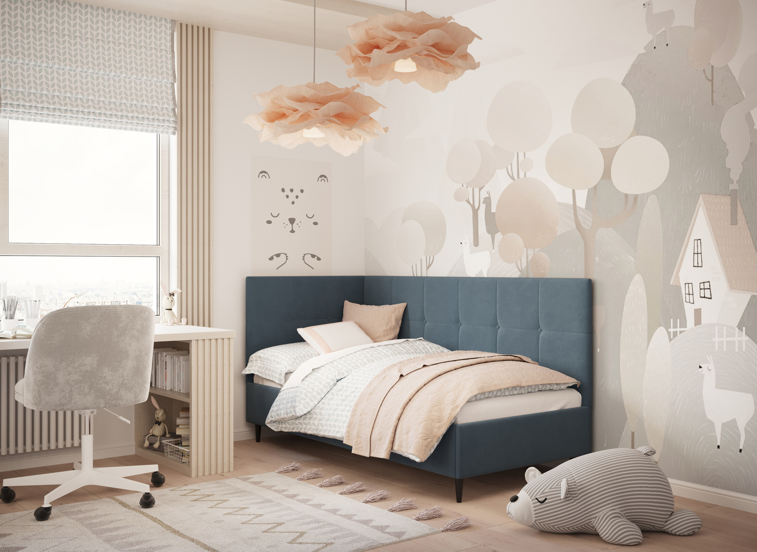 MOON FAMILY 1261 объединяет функциональность и стиль, создавая гармоничное пространство для отдыха и творчества. Кровать доступна в левостороннем и правостороннем исполнении, что позволяет легко адаптировать ее под любые интерьерные особенности.
