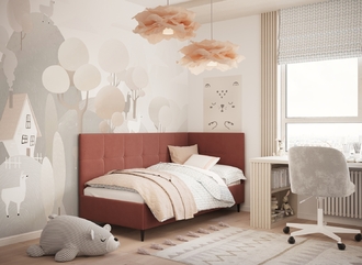 Угловая односпальная кровать MOON FAMILY 1261 с мягкой спинкой и изголовьем создаст в Вашей спальне ощущение уюта. Крупная квадратная стежка привносит в интерьер графических акцентов, а вставка из пуговиц наполняет пространство ощущением домашнего тепла.