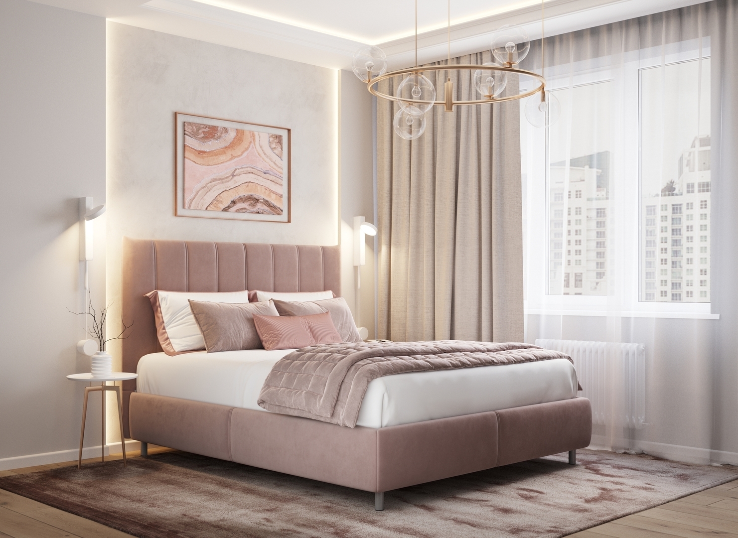 Творчески завершить образ спальни помогут дополнительные аксессуары: декоративные подушки и тумбы.